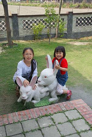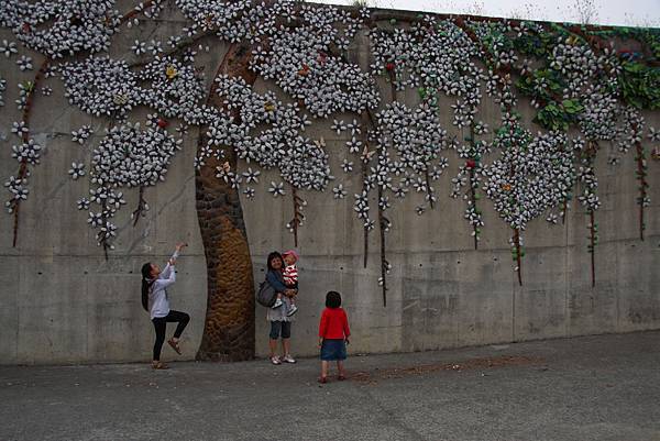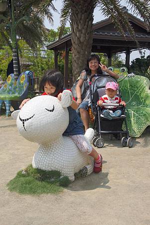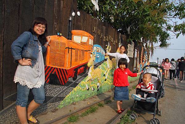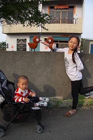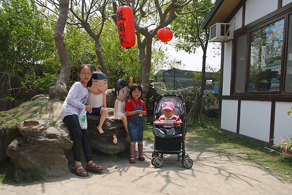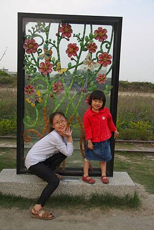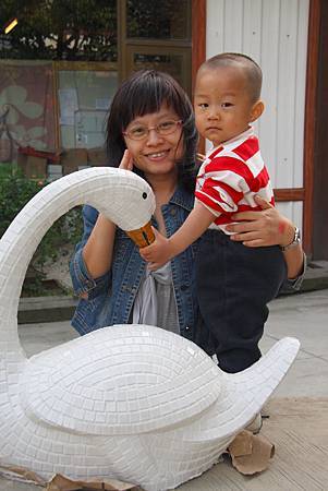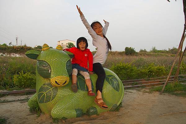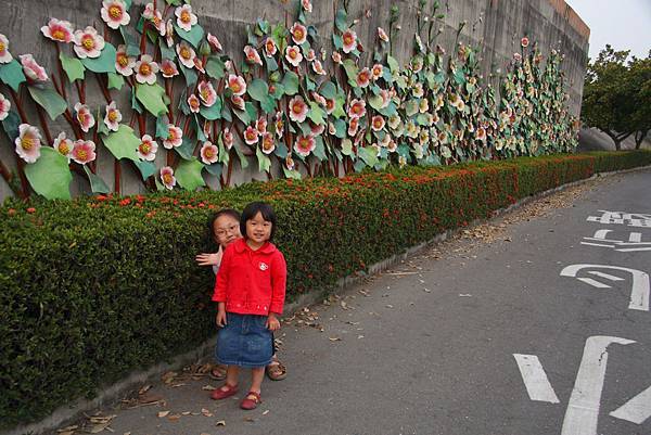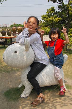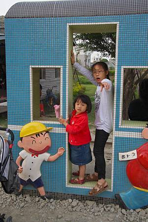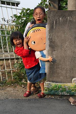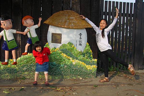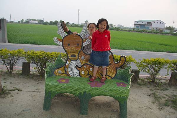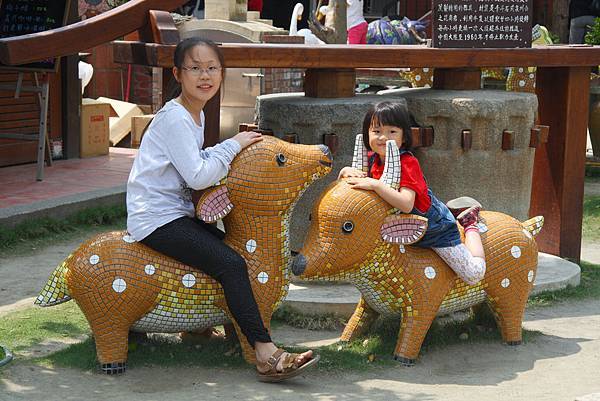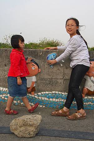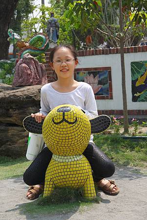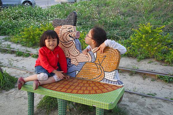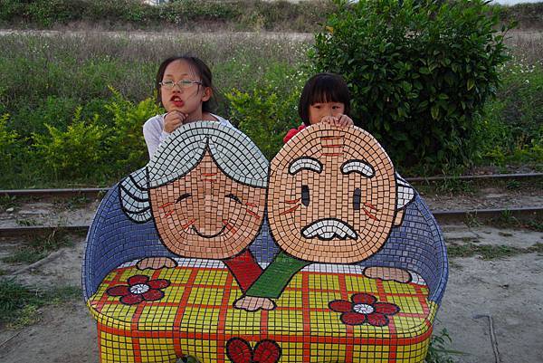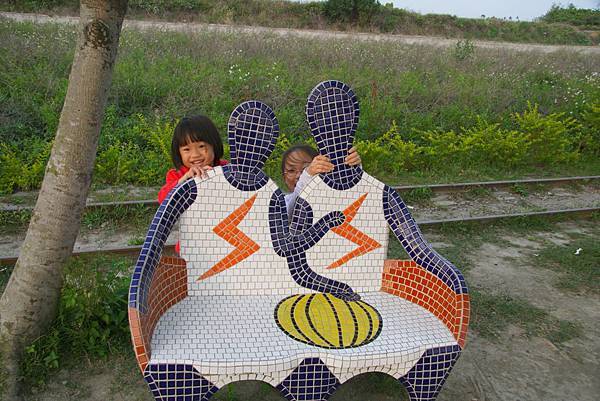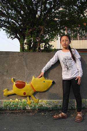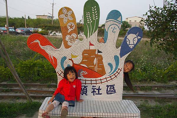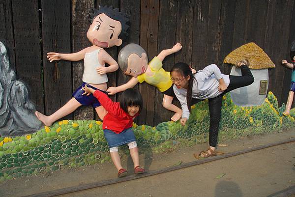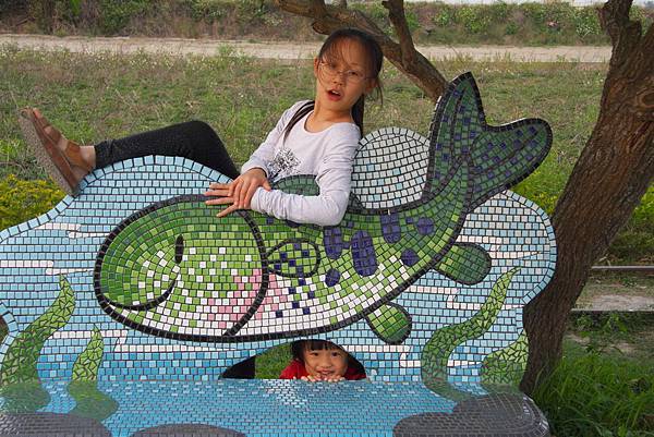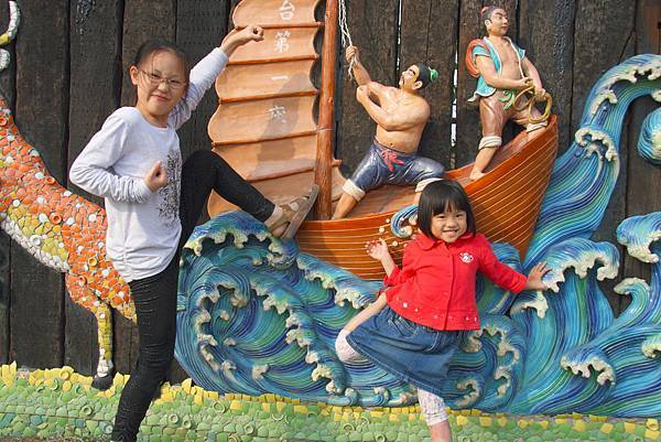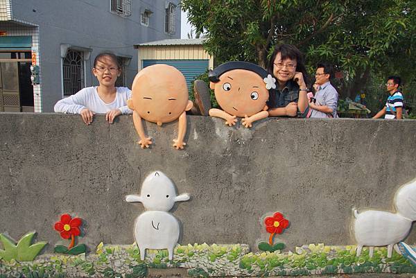 板頭社區真的是一個很有藝術氣息的社區,除了板陶窯外,社區裡還有許多很有趣的馬賽克和剪黏創作。小嫻和婷婷還堅持要跟每個作品合照呢!