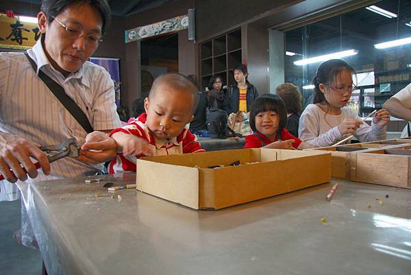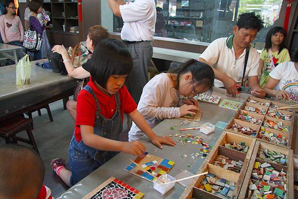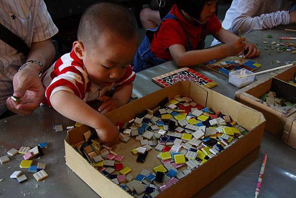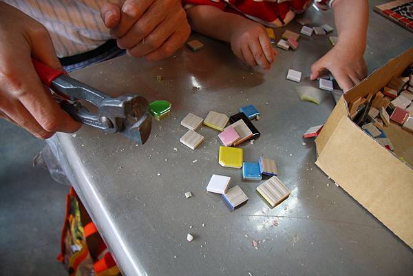 小嫻爸忙著協助把馬賽克剪成小塊的,後來他還剪出心得了呢!他說要從邊邊剪比較好剪,提供給日後想來這兒的朋友們參考囉!